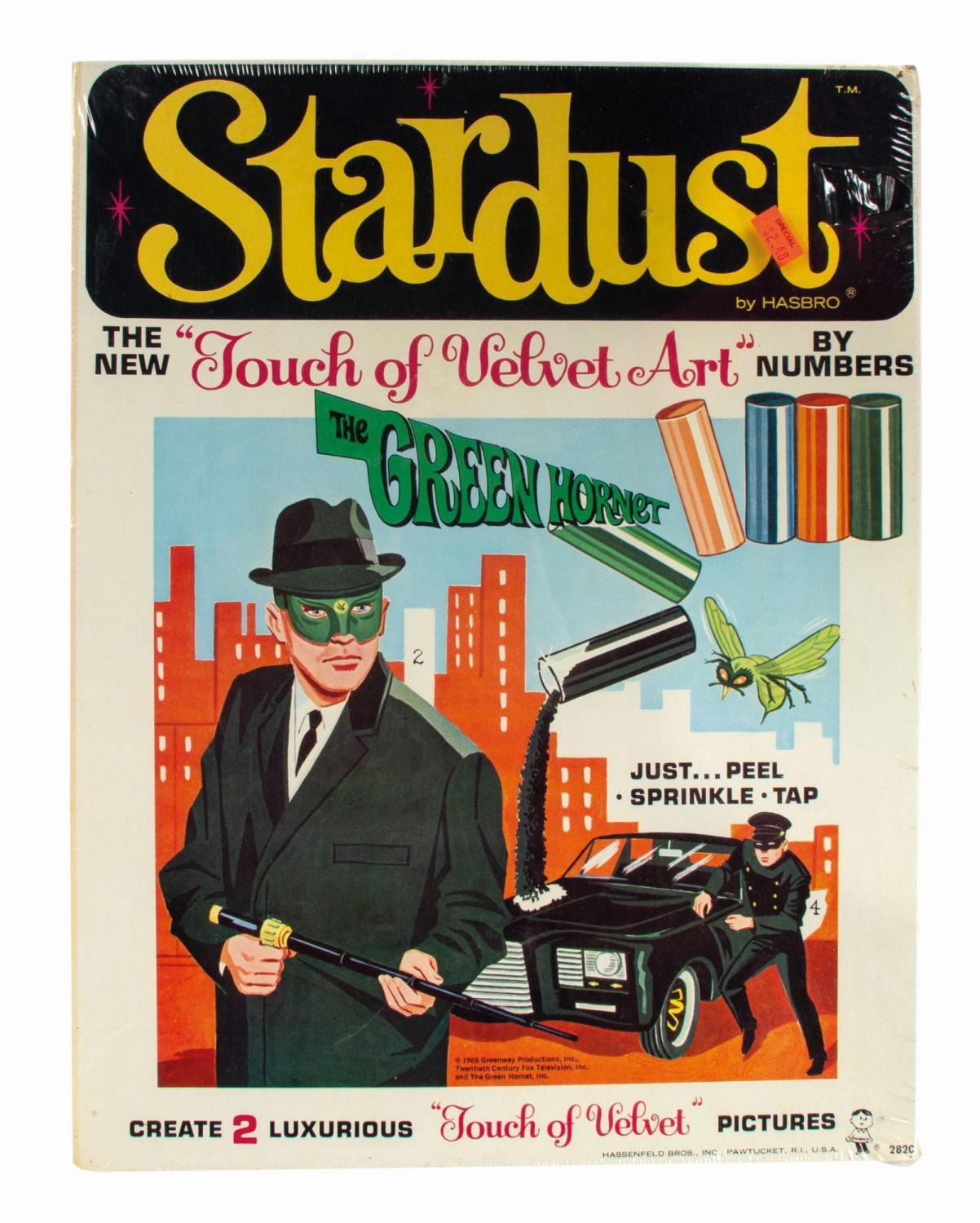 (Hasbro, 1966) A vintage The Green Hornet Art By Numbers Set manufactured by Hasbro. The set includes two "Touch of Velvet" pictures. Never opened, all items are factory sealed with plastic wrap inside the original cardboard box packaging. Measuring 14.75"x11.25" and 1.75" deep, the box is in fine condition with minor corner bumping. It retains a retail price tag at upper right. The contents are completely untouched and as-new.