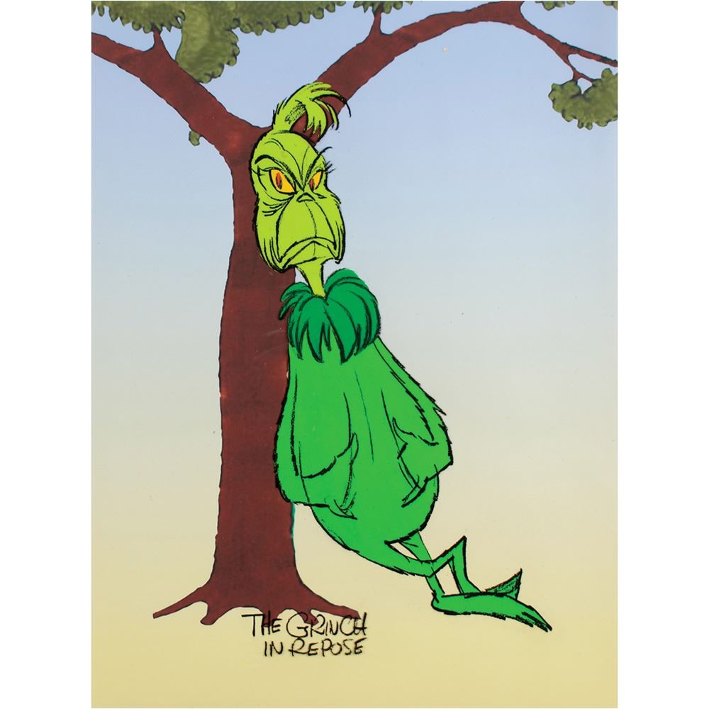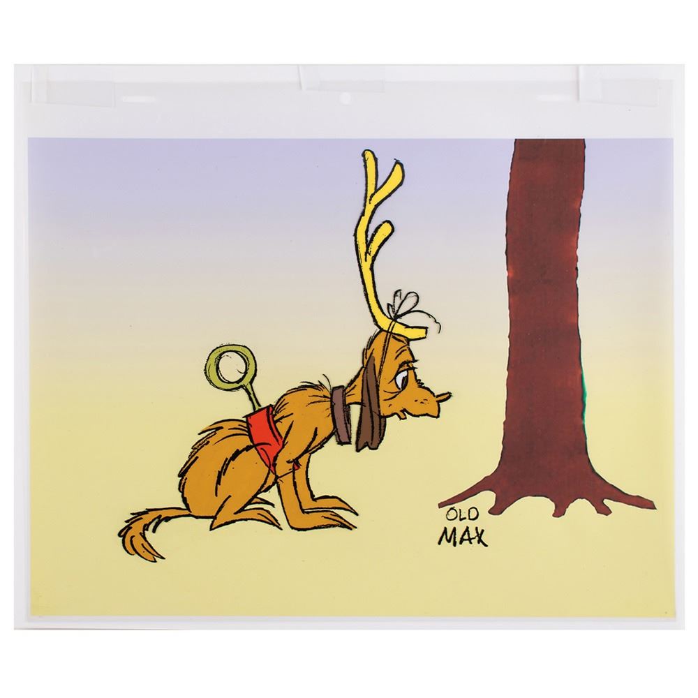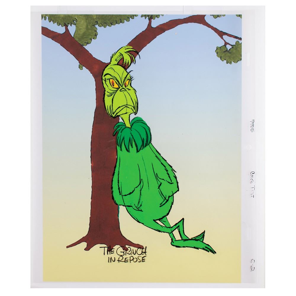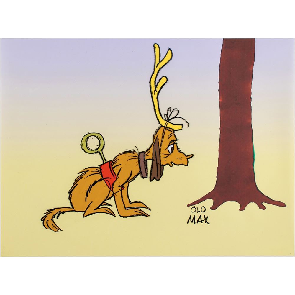 (MGM Studios, 1970s) Very attractive original production color test cels of the Grinch and Max from How the Grinch Stole Christmas!, which shows the characters in brightly colored full-length poses measuring 5.25 x 9.25 (Grinch) and 6.25 x 8 (Max). The Grinch cel is marked along the left edge, "7755, Color Test, C-," and reads: "The Grinch in Repose"; and the Max cel, which shows the dog in his reindeer costume, reads: "Old Max." Both cels are tape-affixed to individual color printed backgrounds measuring 10.75 x 13.25 and 13 x 11. In overall fine condition.