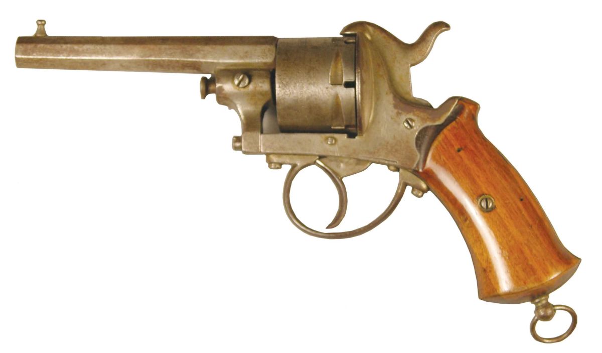 The Guardian 11MM Pinfire revolver. American Model of 1878, Made in Belgium. No bluing, wood grips. 4 inch barrel.