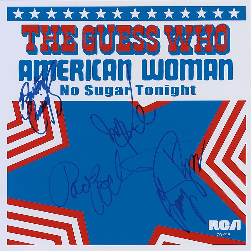 Color glossy 12 x 12 photo of their American Woman cover art, signed in blue felt tip by Burton Cummings, Randy Bachman, Jim Kale, and Garry Peterson. In very fine condition.