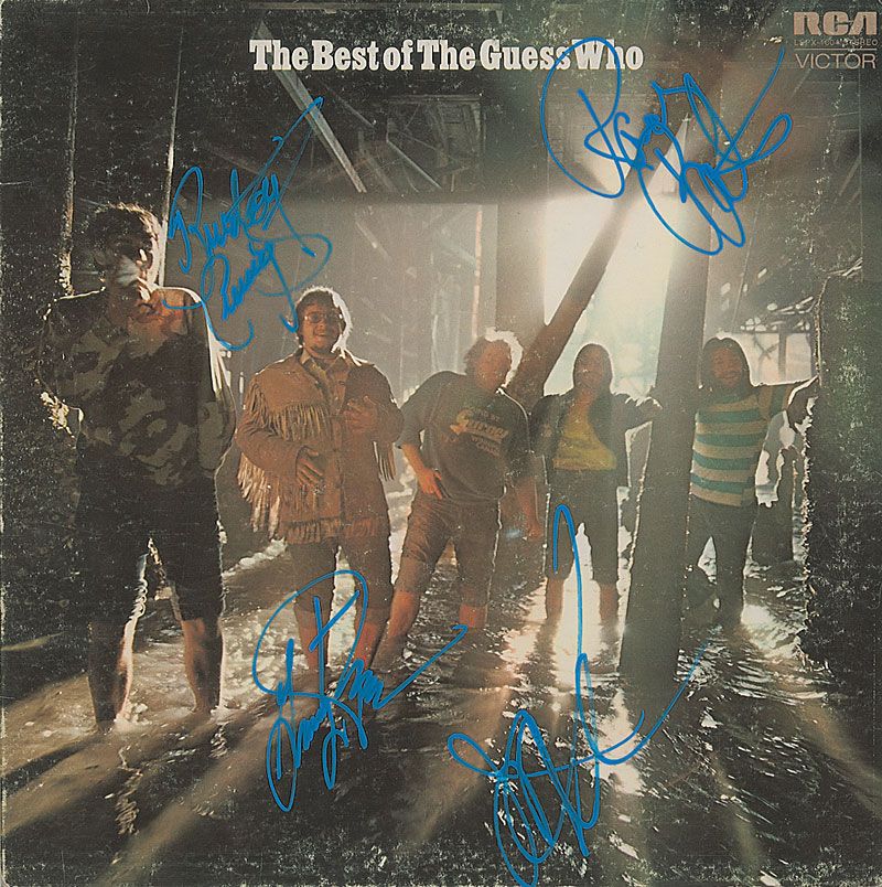 The Best of The Guess Who album signed on the front cover in blue ink by Burton Cummings, Randy Bachman, Jim Kale, and Garry Peterson. Scattered wear and rubbing to covers, otherwise fine condition. The record is included.