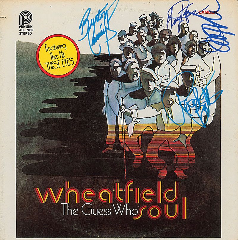 Wheatfield Soul album signed on the front cover in blue ink by Burton Cummings, Randy Bachman, Jim Kale, and Garry Peterson. In fine condition, with a discount cut to the upper left. The record is included.