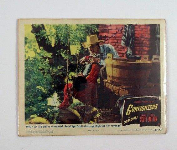 The Gunfighters Randolph Scott Signed Original Lobby Card "The Gunfighters" (1947) was an extremely unusual western, made after World War II, in which a Gunfighter played by action leading man Randolph Scott gives up his guns forever after he is forced to shoot his best friend. It helped bring in a new type of Western hero, personified by such classics as "High Noon", and "The Man Who Shot Liberty Valance". This is an extremely rare and exquisitely printed full color Lobby Card from the movie. A true one-of-a-kind. It is personally signed by Randolph Scott. Beautifully shrink-wrapped for protection. Lobby Card is 14"x11".