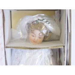 This hand painted and exquisitely costumed "Playing Bride" porcelain doll has been faithfully recreated from an original work of art by Maud Humphrey Bogart. She comes with her Certificate of Authenticity and stands approximately 15 inches. She is in her original box and wrappings and has her own stand. She is in excellent condition.