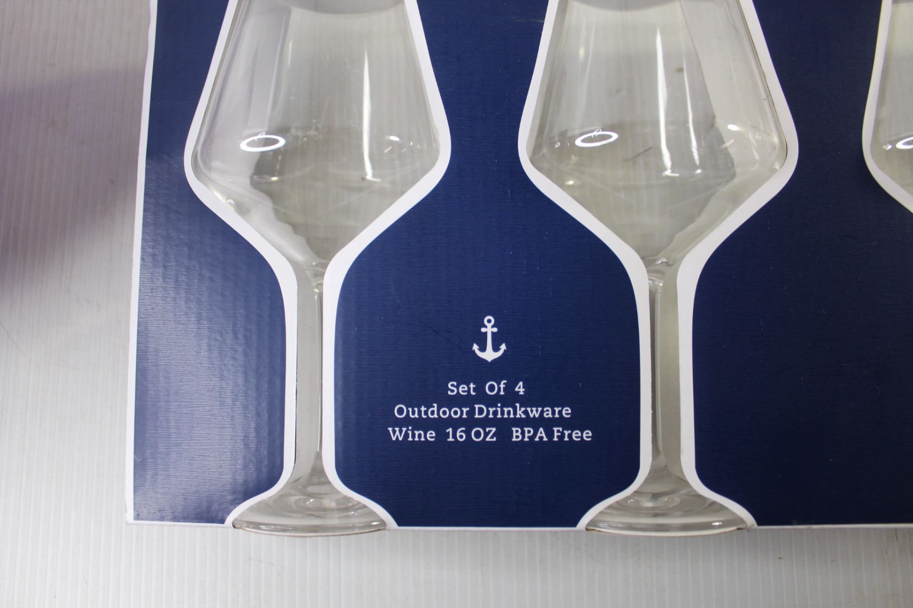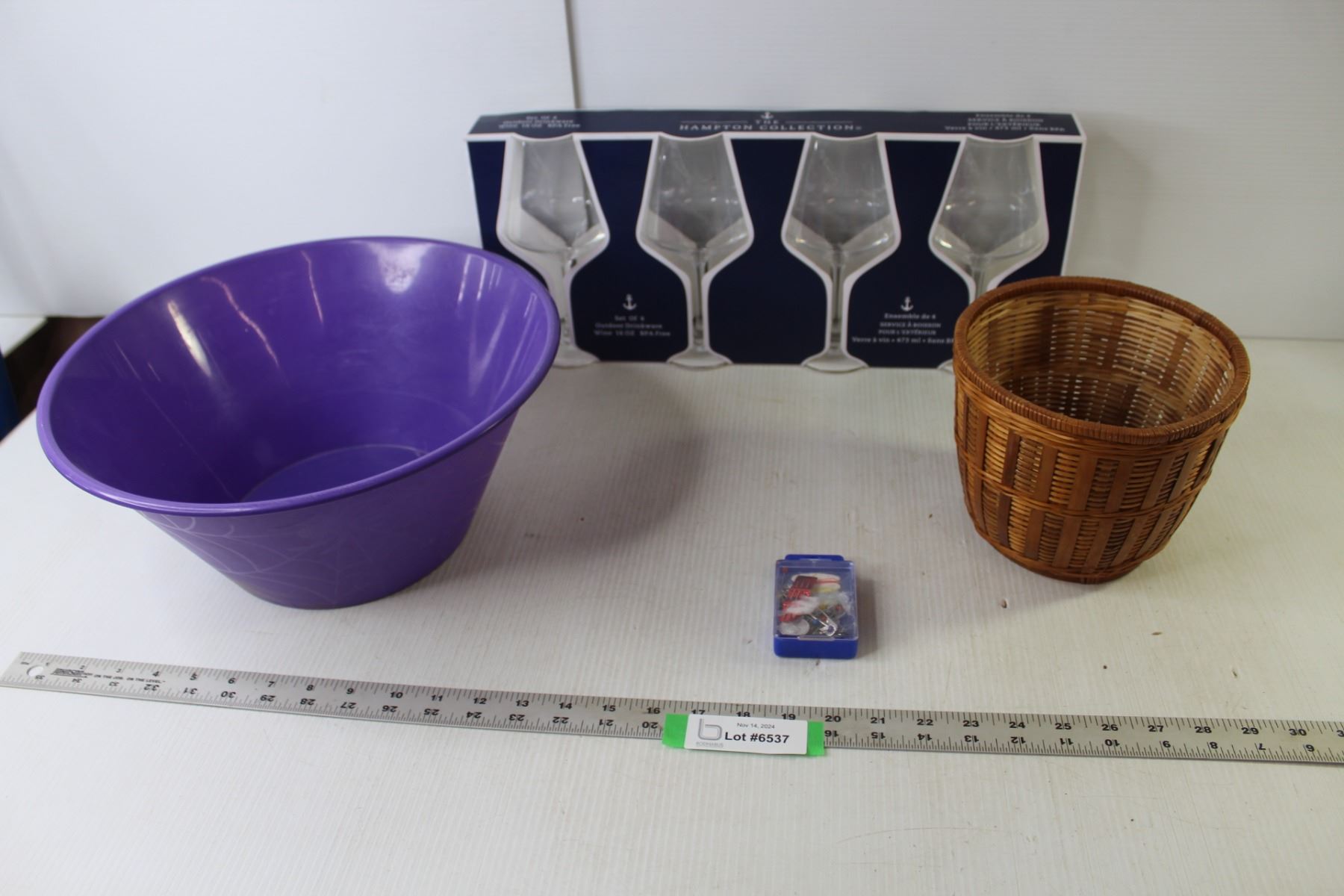 The Hampton Collection Set of 4 Outdoor Drinkware Wine 16 oz (NIB), Small Wicker Basket, Plastic Halloween Themed Plastic Candy Bowl, Small Sewing Kit