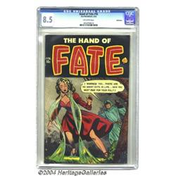 <B>The Hand of Fate #16 Bethlehem pedigree (Ace, 1953) CGC VF+ 8.5 Off-white pages.</B></I> This is the highest grade that CGC has assigned for this issue to date. A certificate from the Bethlehem collection is included with this lot. Overstreet 2004 VF 8.0 value = $115; VF/NM 9.0 value = $160. <BR><BR><B>Important notice:</B> Heritage usually auctions material at the rate of 200-250 lots per hour. On some occasions eBay Live bid software or the Internet may not be able to keep up with the pace of the auction. We recommend placing a realistic absentee bid now as insurance to avoid disappointment. Occasionally the auctioneer may eliminate or reject an eBay Live bid, and the auctioneer may also reopen a lot after the close of the eBay live bidding (usually because we missed an audience bid), and may reject your bid even if it shows you as the winning bidder. By bidding via eBay Live, you agree that Heritage may award the lot to another bidder at its sole discretion under the circumstances described above or any other reasonable circumstances. Since eBay bids are not shown to us until we open the lot on the floor, we treat those bids just like floor bids. In most cases the floor responds before the eBay bid is presented to us, due to Internet lag time, so for consistency we have made it a policy that floor bids are always considered first over tie eBay live bids. Also please note that all Heritage lots purchased through eBay Live carry a 20% Buyer's Premium. Please make sure you read the Terms and Conditions before you bid. </span></font></tr></table></td></tr></table>