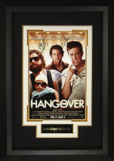 The Hangover is a 2009 American comedy film, co-produced and directed by Todd Phillips and written by Jon Lucas and Scott Moore. The film stars Bradley Cooper, Ed Helms & Zach Galifianakis. It tells the story of Phil Wenneck (Cooper), Stu Price (Helms), Alan Garner (Galifianakis) and Doug Billings (Bartha), who travel to Las Vegas for a bachelor party to celebrate Doug's impending marriage. However, Phil, Stu, and Alan wake up with Doug missing and no memory of the previous night's events, and must find the groom before the wedding can take place.The Hangover was released on June 5, 2009, and was a critical and commercial success. The film became the tenth-highest-grossing film of 2009, with a worldwide gross of over $467 million. This is an signed Publicity Masterprint 11x17 inch movie poster with museum Quality Custom Black Framing as shown to an overall size of 22x30. Bradley Cooper, Ed Helms, and Zach Galifinakis have hand signed this poster. The perfect addition to complement any Home Theater Collection. Witnessed, Examined, and Certified Authentic (Lifetime) by Millionaire Gallery, Inc.