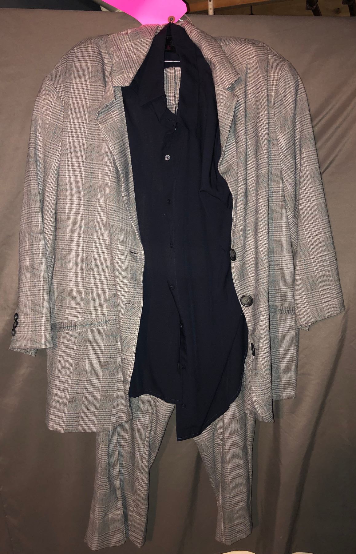 Grey two piece custom made suit and black shirt