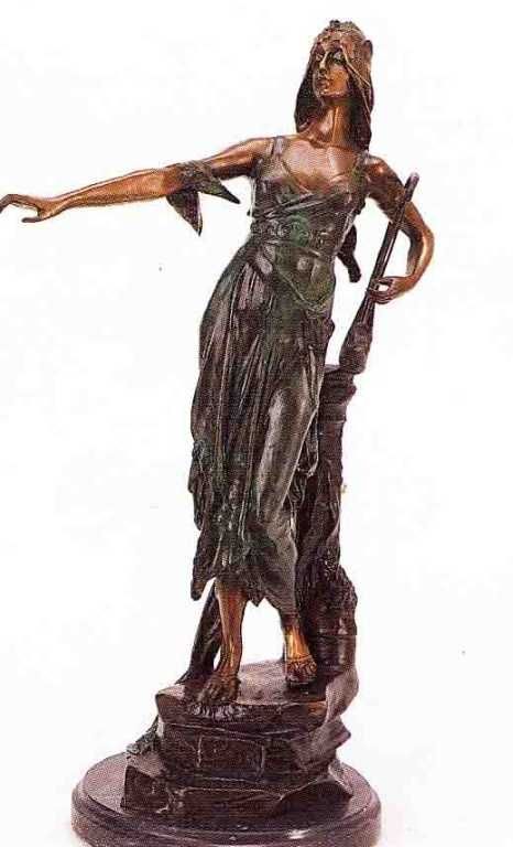 "The Harp Lady" Bronze Sculpture - After Drollos - Museum Quality Verdi Finish - Mounted On A Fine Italian Marble Base - Beautifully Detailed - Signed - Mint Condition - 26"H X 8"W - Lost Wax Cast Bronze