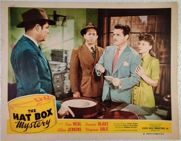 The Hat Box Mystery (Screen Art Pictures Corp., 1947) lobby card. Drama, Short (44 mins). Starring Tom Neal, Pamela Blake, Allen Jenkins. Directed by Lambert Hillyer. Light edge wear, stains, light creases. Very Fine. (11"x14").