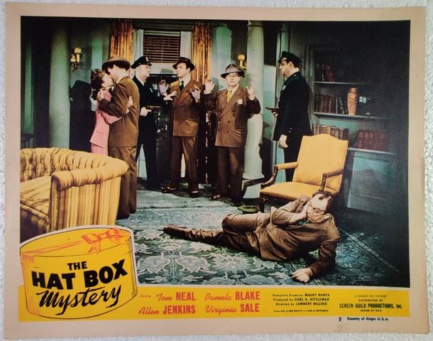 The Hat Box Mystery (Screen Art Pictures Corp., 1947) lobby card. Drama, Short (44 mins). Starring Tom Neal, Pamela Blake, Allen Jenkins. Directed by Lambert Hillyer. Light edge wear, light stains, light creases. Excellent. (11"x14").