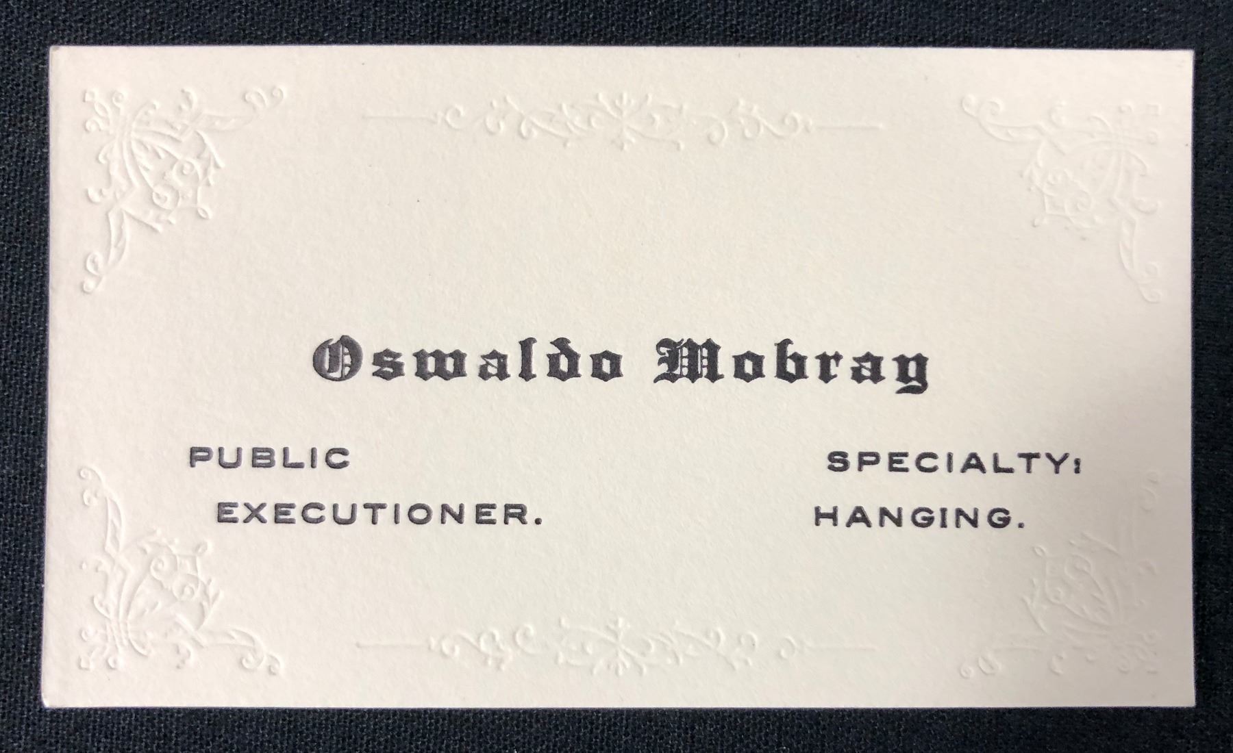 Original business card used by Oswaldo Mobray, played by Tim Roth from the Quentin Tarantino created western film "The Hateful Eight" (2015), where in the dead of a Wyoming winter, a bounty hunter and his prisoner find shelter in a cabin currently inhabited by a collection of nefarious characters. Starring Samuel L. Jackson, Kurt Russell, Jennifer Jason Leigh, Walton Goggins, Demián Bichir, Tim Roth, Michael Madsen, and Bruce Dern.