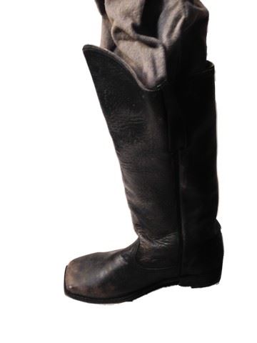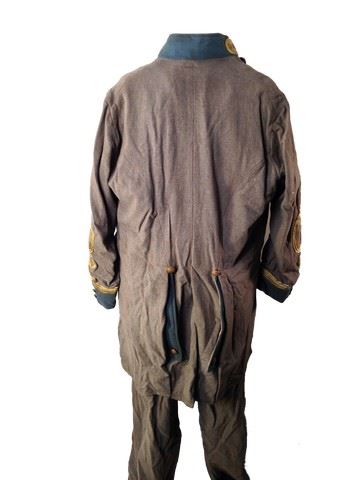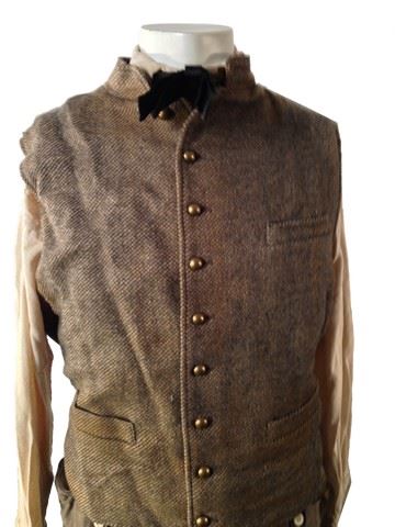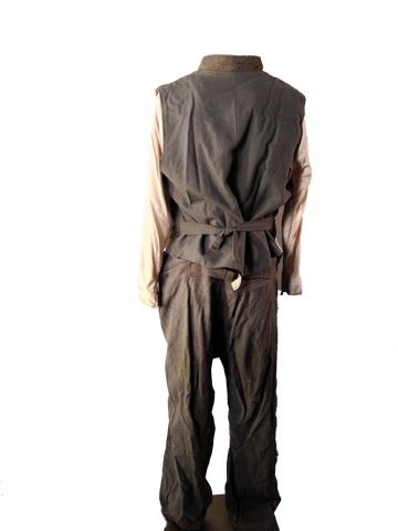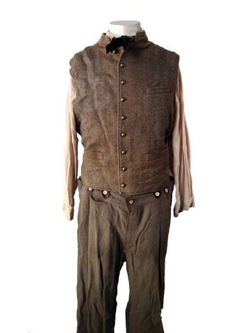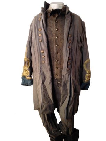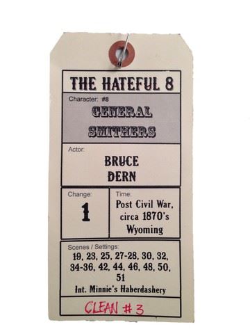 General Smithers (Bruce Dern) screen worn, hero, wool double breasted uniform coat with brass bottoms and blue wool piping, gold filigree insignia on the sleeves and three star general patches on the collar, white weave cotton off white shirt with four buttons, aged grey wool pants with front seem pockets, black satin "Mu" bow tie, diagonal wool twill with stand collar vest that has a adjustable waist, black leather square toe boots with sheepskin lining, brown leather suspenders. Worn in scenes 19-50. Wardrobe tag included.