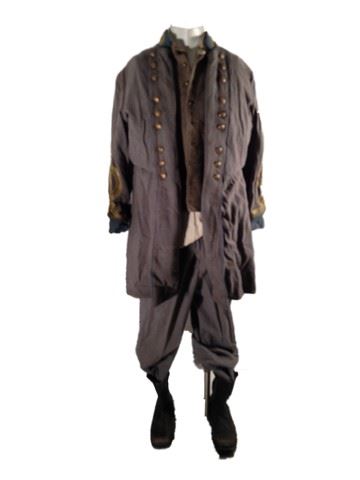 General Smithers (Bruce Dern) screen worn, hero, wool double breasted uniform coat with brass bottoms and blue wool piping, gold filigree insignia on the sleeves and three star general patches on the collar, white weave cotton off white shirt with four buttons, aged grey wool pants with front seem pockets, black satin "Mu" bow tie, diagonal wool twill with stand collar vest that has a adjustable waist, black leather square toe boots with sheepskin lining, brown leather suspenders. Worn in scenes 19-50. Wardrobe tag included.