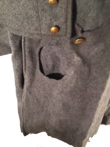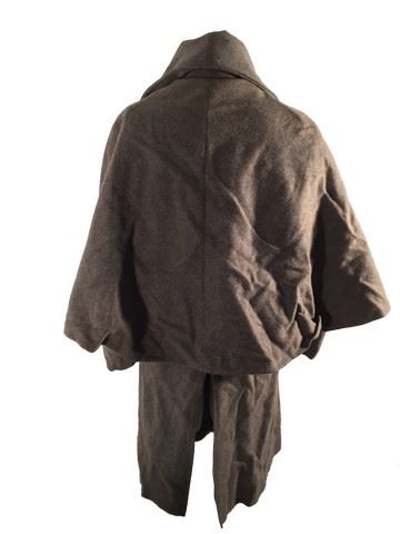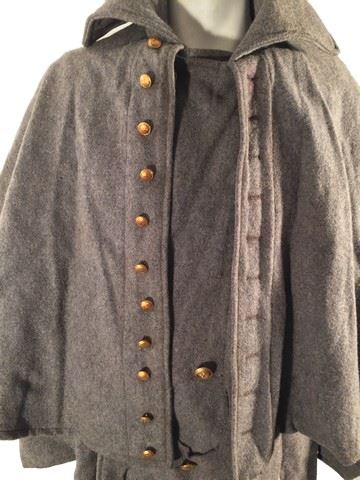 General Smithers (Bruce Dern) screen worn, hero, grey military style wool coat with gold colored buttons labeled "C.S.A., the coat has a cape over the top of shoulders, production soiled and torn, the coat is taken and worn by Sheriff Chris Mannix (Walton Goggins).