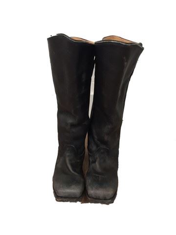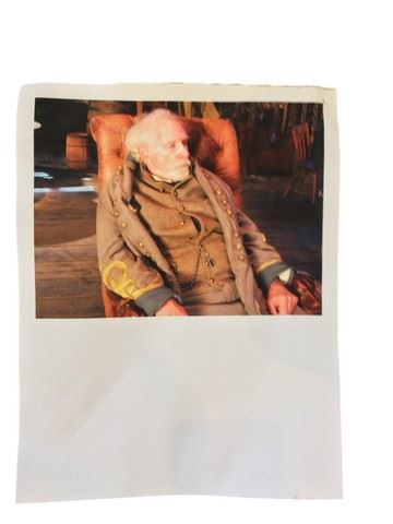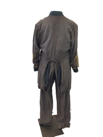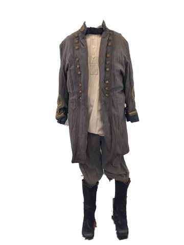 General Smithers (Bruce Dern) screen worn, stunt, wool double breasted uniform coat (labeled stunt) with brass bottoms and blue wool piping, gold filigree insignia on the sleeves and three star general patches on the collar, white weave cotton off white shirt with four buttons, aged grey wool pants with front seam pockets, black satin "Mu" bow tie, black leather square toe boots (labeled stunt). Worn in scenes 19-51. Wardrobe tag included, labeled clean #5. This is the last costume like this available from the production.