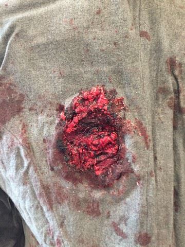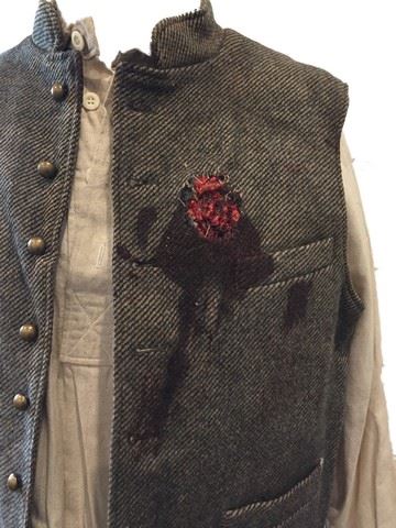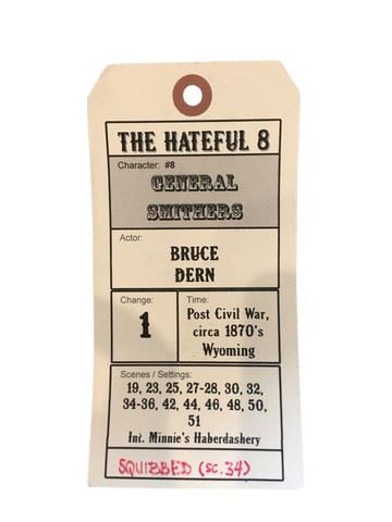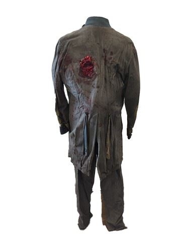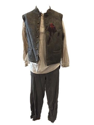 General Smithers (Bruce Dern) screen worn, wool double breasted uniform coat with brass bottoms and blue wool piping, gold filigree insignia on the sleeves and three star general patches on the collar, coat has gun shot wound on the back with exposed flesh, entire wardrobe very bloody from production, very dirty cream weave cotton shirt with four buttons, twill grey vest with gun shot wound on the chest ,aged grey wool pants with front seam pockets. Worn in scenes 19-51. Wardrobe tag included, labeled squibbed scene #34.