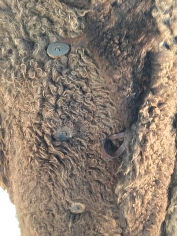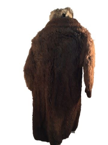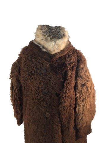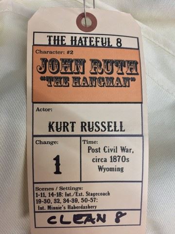 John Ruth (Kurt Russell) screen worn, hero, buffalo brown fur coat with 4 loop leather closure and wooden buttons, badger fur hat pill box style. Wardrobe tag included and labeled as "Clean 8". Worn in multiple scenes.