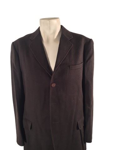 Jon Ruth (Kurt Russell) screen worn, hero, dark chocolate brown heavy wool sport coat, dark brown pants made of a canvas material. Wardrobe tag included. Worn in multiple scenes, labeled "clean #8".