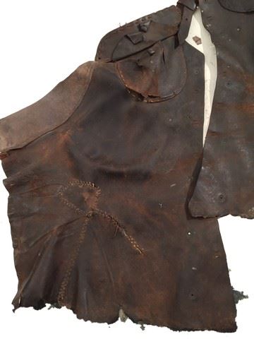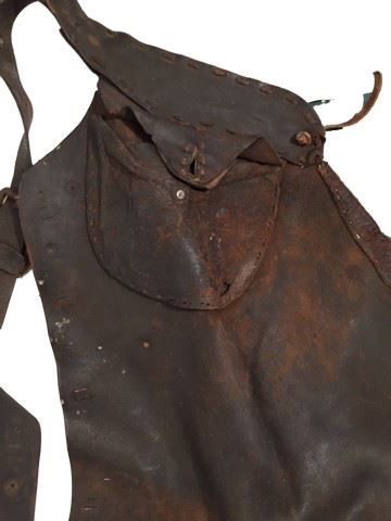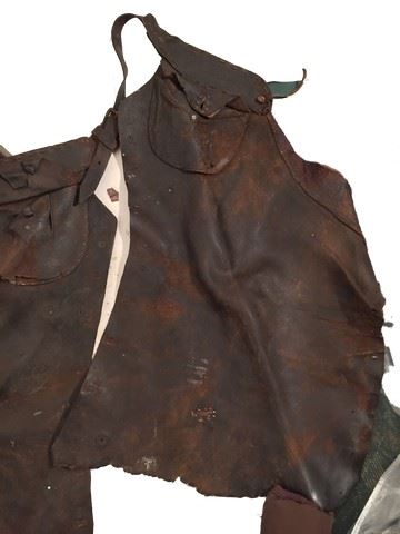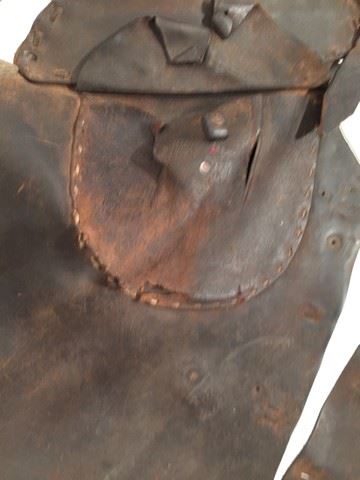 Non principal character's screen worn brown leather chaps worn throughout the movie by multiple characters, the top of the chaps buckle into the belt loops with pockets for storage and leather straps with hooks that attach the chaps around the legs.(37x27)