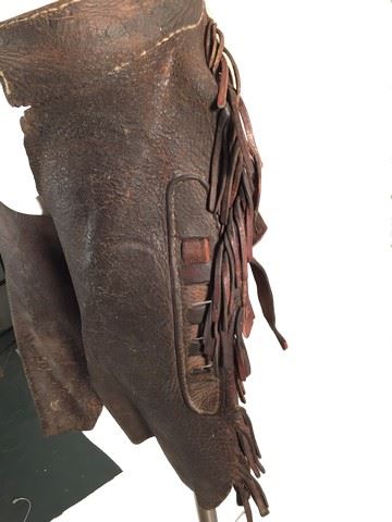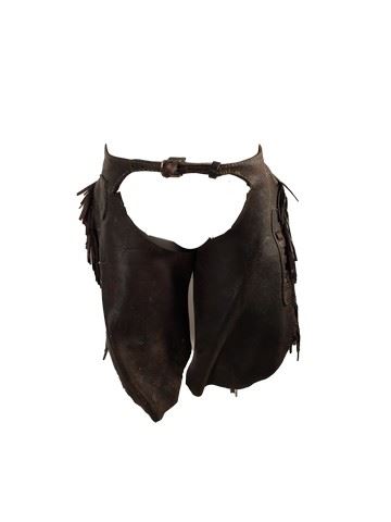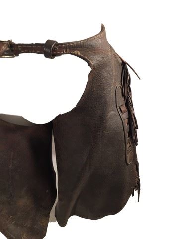 Non principal character's screen worn brown leather chaps worn throughout the movie by multiple characters, the top of the chaps buckle into the belt loops with pockets for storage and leather straps with hooks that attach the chaps around the legs, the sides of the chaps have a leather fringe and only go to the knee.(23x23)
