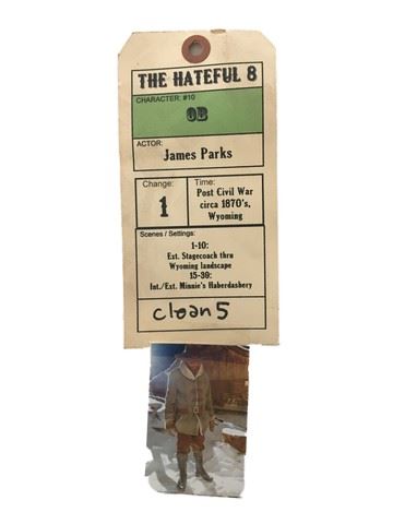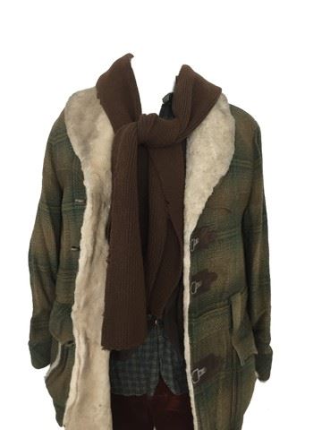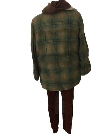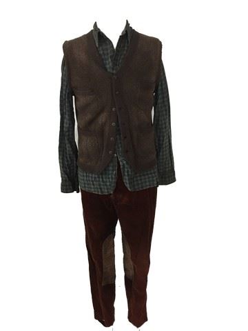 OB (James Parks) screen worn, hero "Clean #5", heavy green plaid with fur lining and metal front closure worn jacket, brownish red knit vest, green and blue plaid long sleeve button front shirt, brown wool scarf, brown corduroy pants with suede riding inserts. Wardrobe tag included with picture with him wearing the outfit.