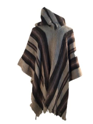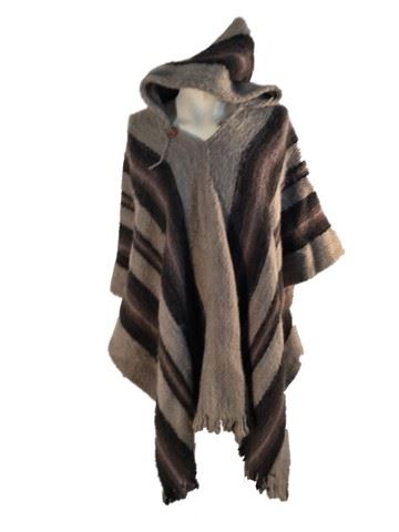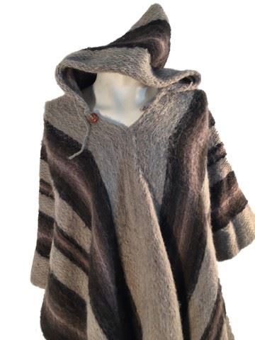 Screen worn by a non principal character, this is a grey wool cape style coat with different shades of brown stripes and fringe all around the edge. The coat is worn like a poncho and has a hood.