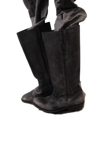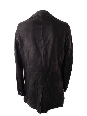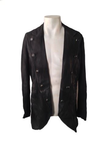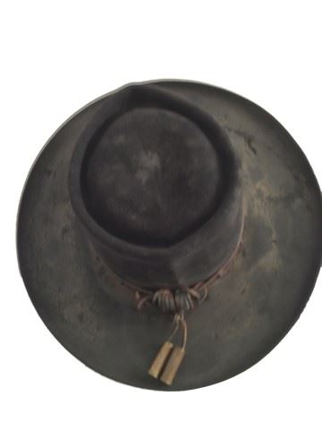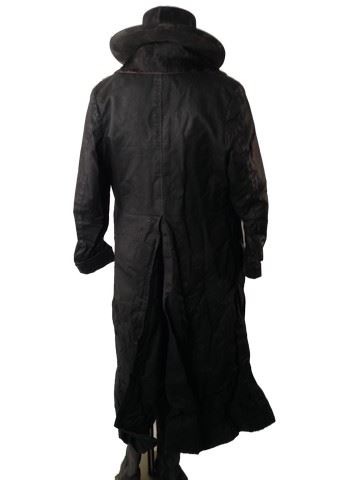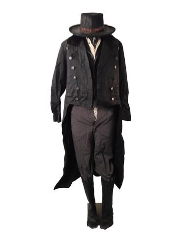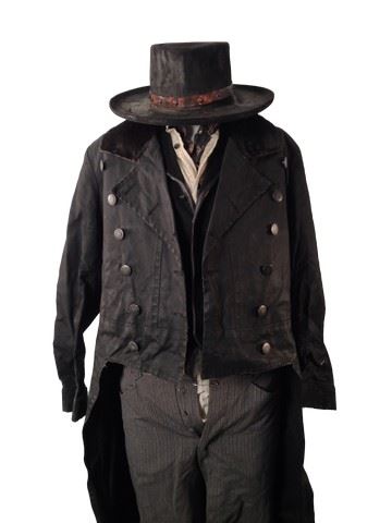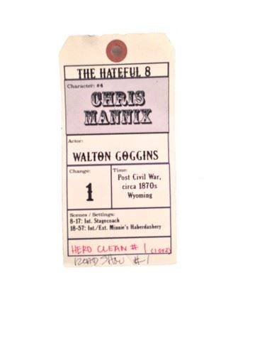 Sheriff Chris Mannix (Walton Goggins) screen worn, hero, black suede "Varvatos" jacket, black duster with black waxed canvas and brown cowhide collar, white with black strips shirt, black wool vest with black leather trim, grey wool with black and gold metallic morning stripe, black leather "Varvatos" belt, black gambler hat with flat brim and brown leather metal studs, shot gun shell ornament on the back , black leather knee high ropers. Worn in 18-57. Wardrobe tag included.