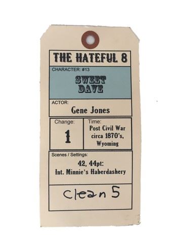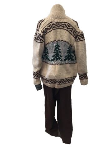 Sweet Dave (Gene Jones) screen worn costume. Cardigan - loose knit w/ midsection, swath of large pine tree pattern on gray background. Brown zig-zag patterned 3" stripe near top and bottom. Four button, front shawl collar. Shirt - Light brown & dark teal, checkered cotton, brown knit pants. Wardrobe tag included.