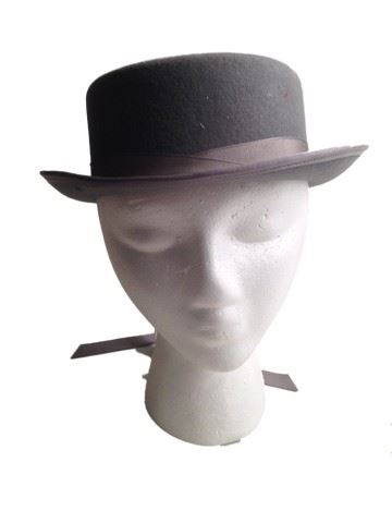 Grey felt women's top hat with satin ribbon around the brim and ties in a bow in the back. Screen used by a non principal character. (9"x10")