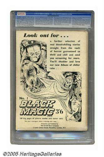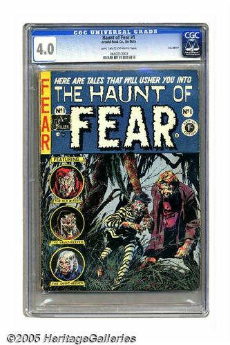 <B>The Haunt of Fear #1 (Arnold Book Co., 1954) CGC VG 4.0 Light tan to off-white pages.</B></I> The "#1" and the fact that this is a giant-size comic book should pique your interest. This UK edition was comprised of EC reprints from two sources, <B>Haunt of Fear</B></I> #23 and <B>Shock Suspenstories</B></I> #14, both from 1954, plus a non-EC strip, <I>Flash Foster</B></I>. Britain's counterpart to Dr. Fredric Wertham, George H. Pumphrey, blasted virtually every story in this compilation in an inflammatory pamphlet, <B>Comics and Your Children</B></I>. Curiously, one story that wasn't skewered was "The Whipping," which did prompt sharp exchanges between Wertham and William C. Gaines in the US Senate hearings. An historic comic book in the anti-comics campaign in the UK, very few copies survived, in large part because teachers and newspapers urged parents to search their kids' bedrooms and destroy <I>any</B></I> horror comics, not just this especially offensive one! This is the only copy to be certified by CGC to date. Not listed in Overstreet. CGC census 6/05: 1 in 4.0, none higher.