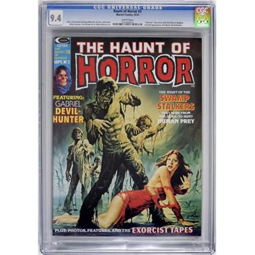 <B>The Haunt of Horror #3 (Curtis , 1974) CGC NM 9.4 White pages.</B></I> Second appearance of Gabriel, Devil-Hunter. Jad cover. Pat Broderick and Pablo Marcos art. "Exorcist" interview with the Marvel bullpen. Overstreet 2007 NM- 9.2 value = $28. CGC census 10/07: 3 in 9.4, 11 higher.<BR><BR><b>Shipping:</b> Comics - Slabbed (certified) (<a target="_blank" href="http://www.heritageauctions.com/common/shipping.php">view shipping information</a>)