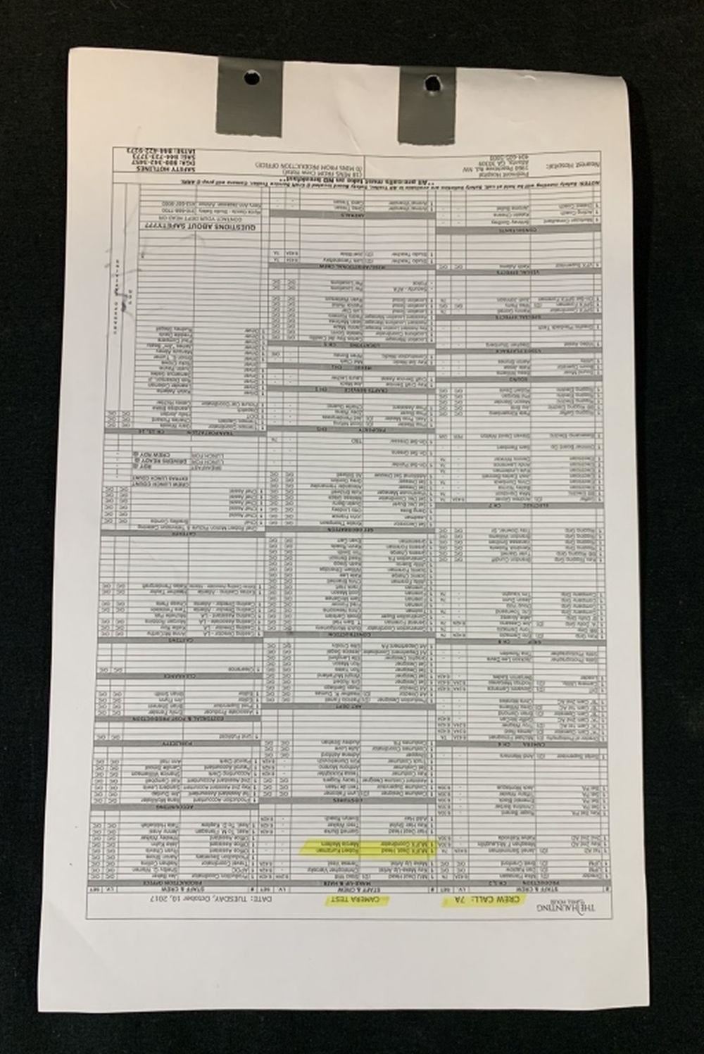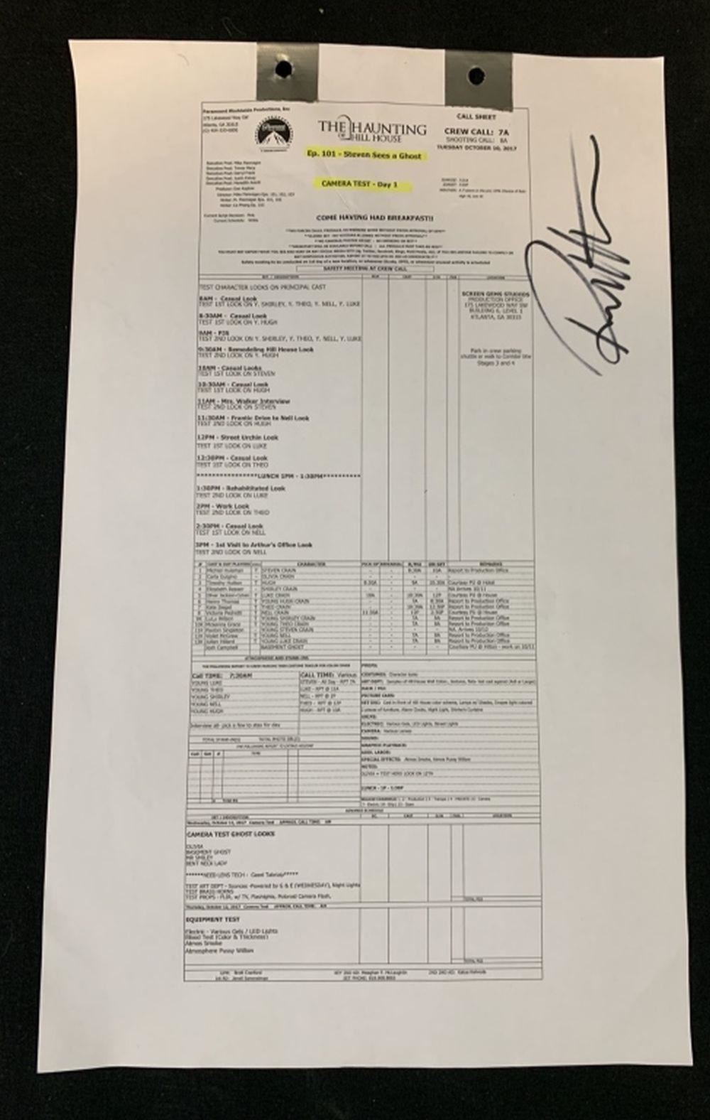 Original call sheet set used by Robert Kurtzman who was the special effects makeup department head on the supernatural horror drama television series "The Haunting of Hill House (2018–), where, flashing between past and present, a fractured family confronts haunting memories of their old home and the terrifying events that drove them from it.