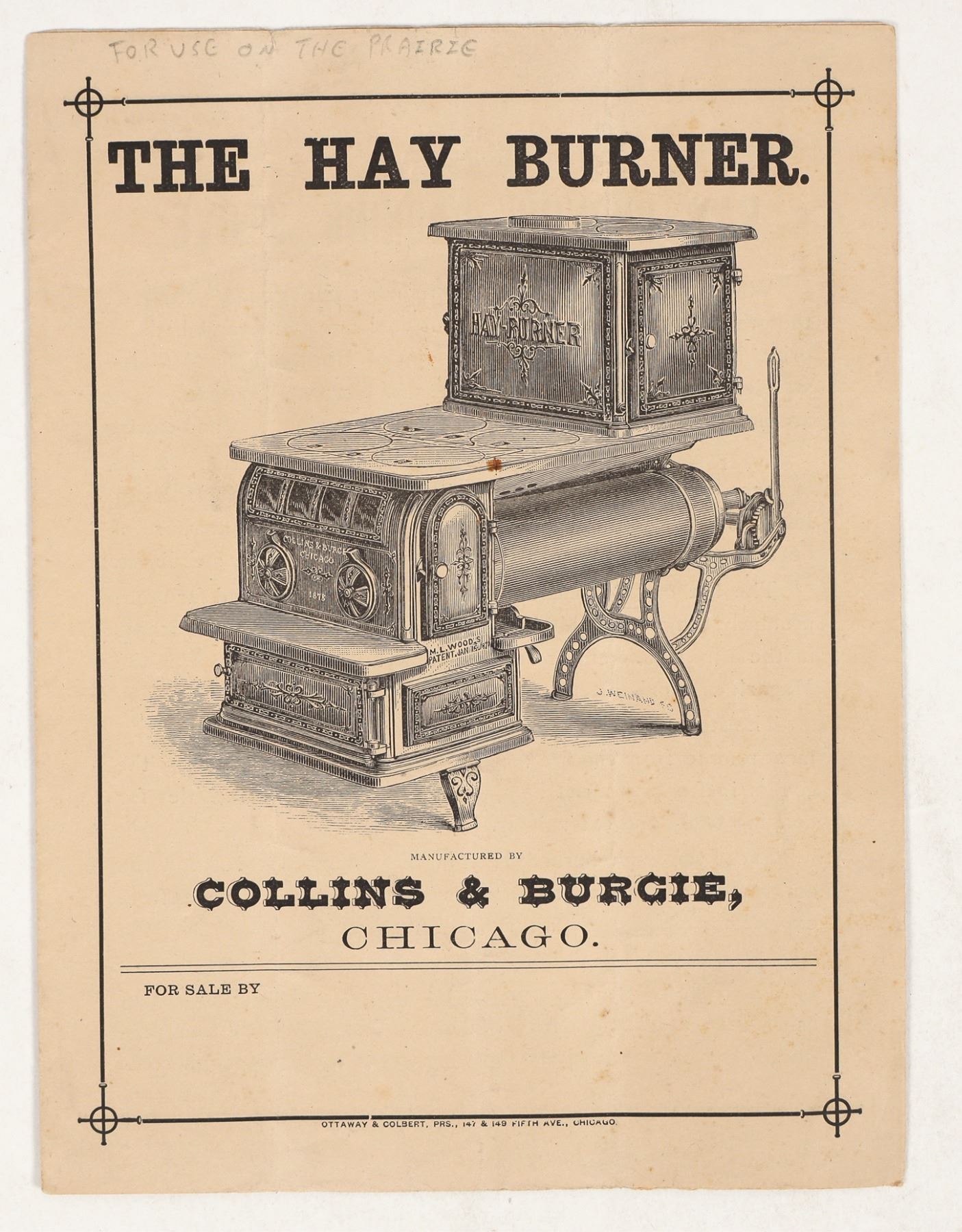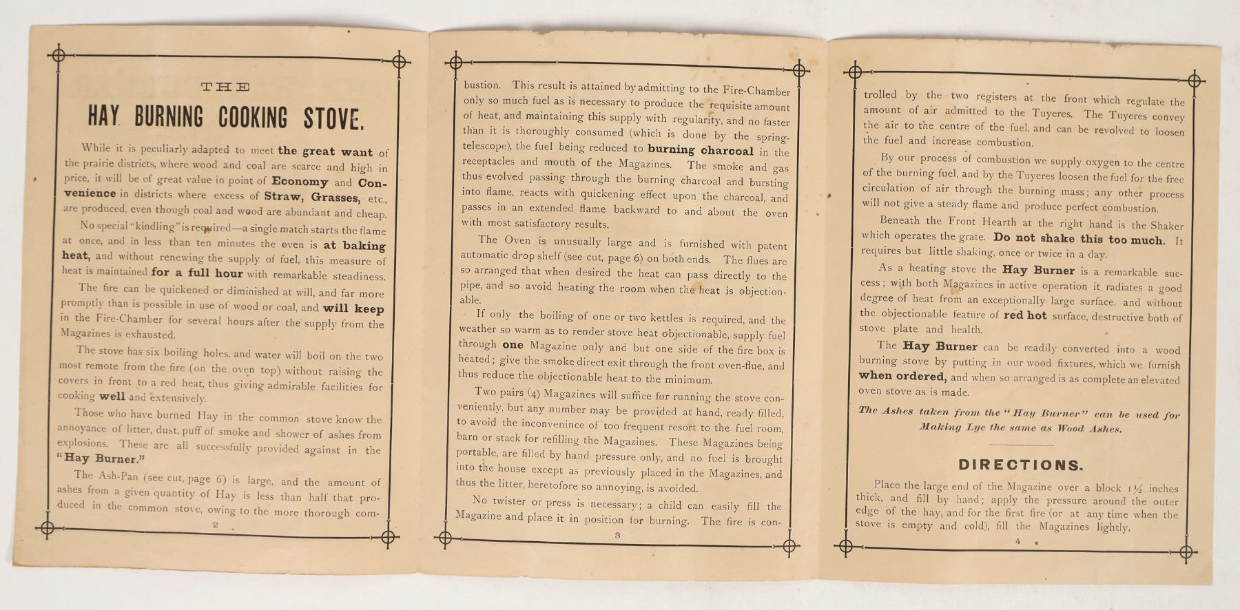 Handout advertisement for the Hay Burner Stove, 1877-82, 6 pages. Designed for settlers living in the prairie states where hay and grasses were more plentiful to burn to provide heating and cooking, as wood would have been too expensive at the time. In excellent cond.
