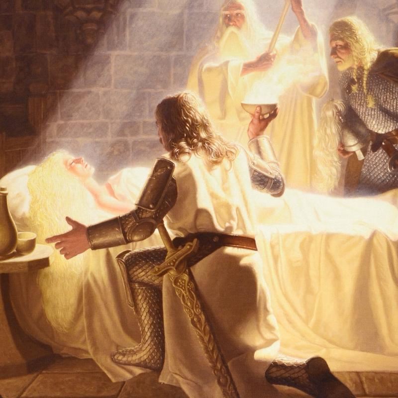 Known world wide for their fantasy and science fiction illustrations, identical twin brothers Greg and Tim Hildebrandt created an abundance of fascinating artwork, most notably their illustration work for J.R.R. Tolkien's 'The Hobbit' and 'Lord of the Rings'. "The Healing Of Eowyn", originally created in the 1970's for Ballantine Books, is a limited edition giclee on canvas, numbered and hand signed by Greg Hildebrandt! Includes Certificate of Authenticity! Measures approx. 28" x 21" (image).