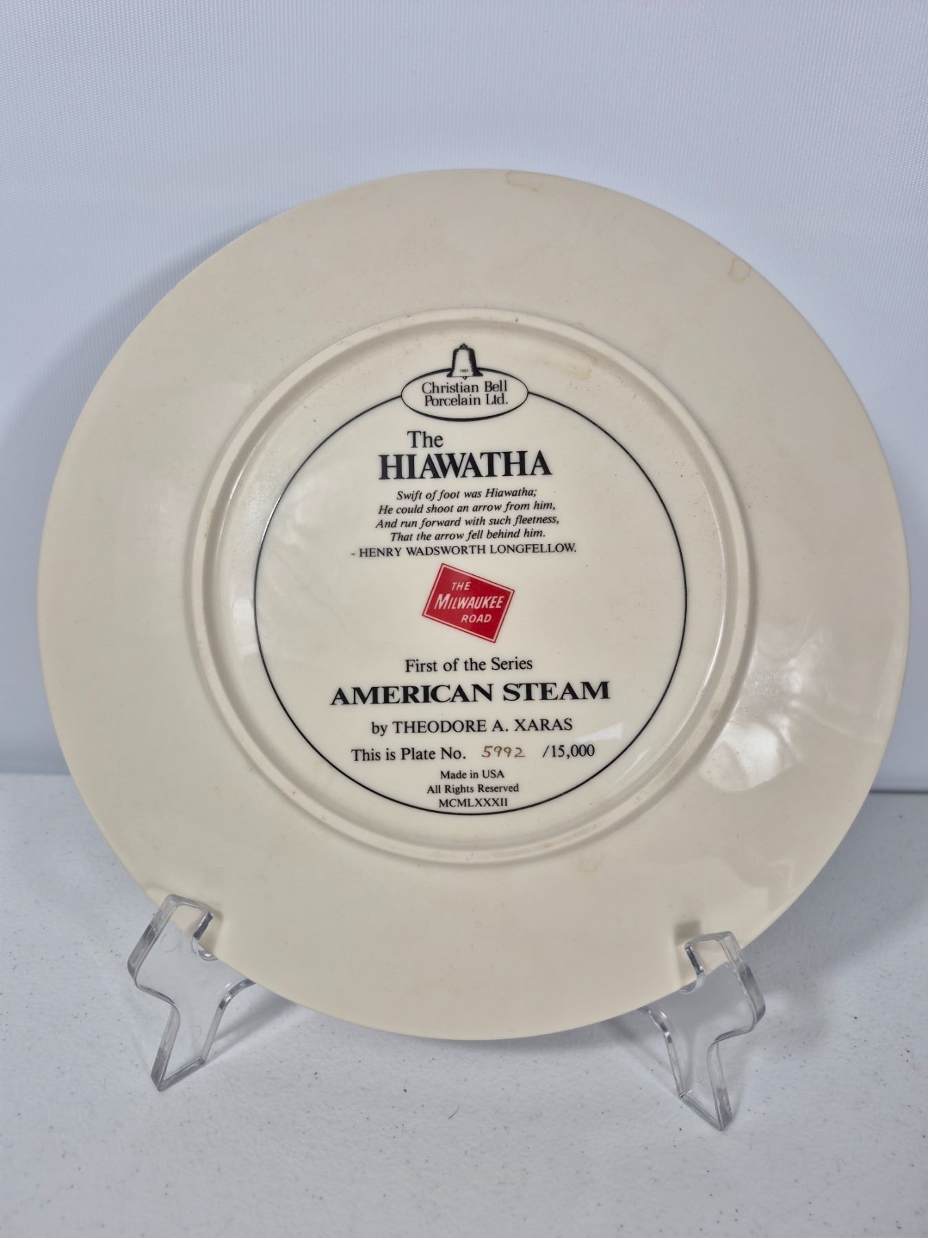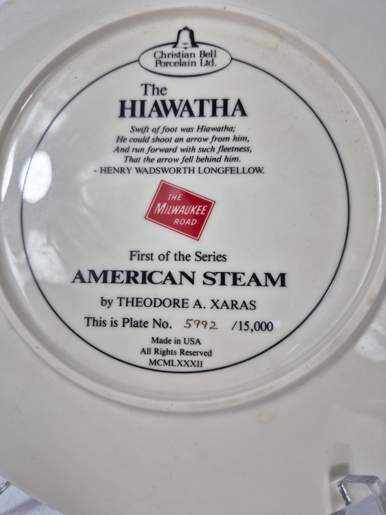 Limited edition porcelain collector plate titled 'The Hiawatha', first in the American Steam series by Theodore A. Xaras. Produced by Christian Bell Porcelain Ltd. for The Milwaukee Road. Features detailed artwork of steam and diesel locomotives in a rail yard scene. Includes Henry Wadsworth Longfellow quote. Plate No. 5992/15,000. Dated 1982.