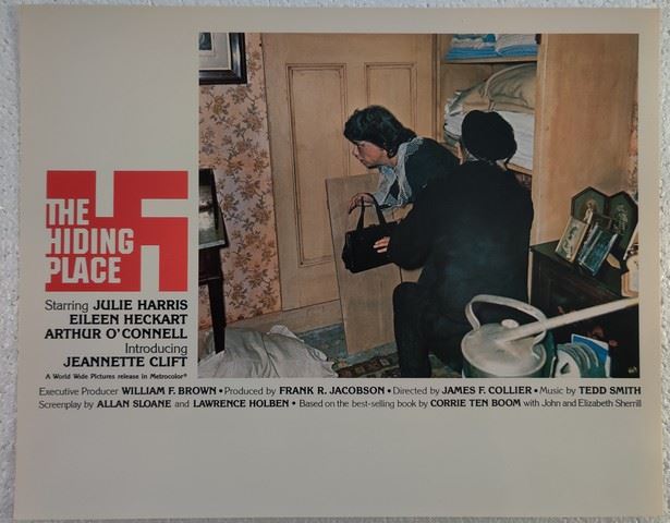 The Hiding Place (World Wide Pictures [WWP], 1975) lobby card. Drama, War. Starring Julie Harris, Jeannette Clift, Arthur O'Connell, Robert Rietty, Pamela Sholto, Paul Henley, Richard Wren, Broes Hartman, Lex van Delden, Tom van Beek, Nigel Hawthorne, John Gabriel, Edward Burnham, Forbes Collins, Cyril Shaps, Bernard Severn, Bernard Kay, David de Keyser, Guus Hermus, Norman Rodway, Michael Sheard, Ron Daniels, Peter Hager, Eileen Heckart, Bernard Archard, Carol Gillies, Lillias Walker, Irene Prador. Directed by James F. Collier. Very light edge wear. Near Mint. (11"x14").
