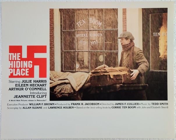 The Hiding Place (World Wide Pictures [WWP], 1975) lobby card. Drama, War. Starring Julie Harris, Jeannette Clift, Arthur O'Connell, Robert Rietty, Pamela Sholto, Paul Henley, Richard Wren, Broes Hartman, Lex van Delden, Tom van Beek, Nigel Hawthorne, John Gabriel, Edward Burnham, Forbes Collins, Cyril Shaps, Bernard Severn, Bernard Kay, David de Keyser, Guus Hermus, Norman Rodway, Michael Sheard, Ron Daniels, Peter Hager, Eileen Heckart, Bernard Archard, Carol Gillies, Lillias Walker, Irene Prador. Directed by James F. Collier. Very light edge wear, very light creases. Excellent. (11"x14").