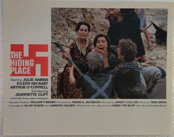 The Hiding Place (World Wide Pictures [WWP], 1975) lobby card. Drama, War. Starring Julie Harris, Jeannette Clift, Arthur O'Connell, Robert Rietty, Pamela Sholto, Paul Henley, Richard Wren, Broes Hartman, Lex van Delden, Tom van Beek, Nigel Hawthorne, John Gabriel, Edward Burnham, Forbes Collins, Cyril Shaps, Bernard Severn, Bernard Kay, David de Keyser, Guus Hermus, Norman Rodway, Michael Sheard, Ron Daniels, Peter Hager, Eileen Heckart, Bernard Archard, Carol Gillies, Lillias Walker, Irene Prador. Directed by James F. Collier. Very light edge wear, very light creases. Excellent. (11"x14").