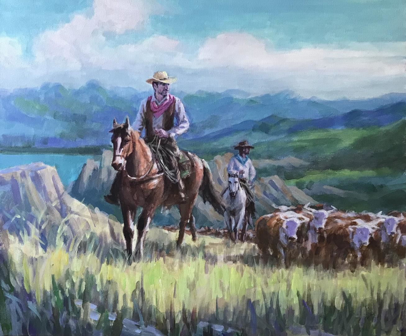 Cowboys and their cattle move up to a greener pasture. An original 24x30" acrylic on stretched canvas by Richard Ho. w/COA.