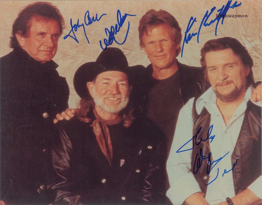 Color glossy 14 x 11 photo of The Highwaymen, signed in blue felt tip by Johnny Cash, Waylon Jennings, Willie Nelson, and Kris Kristofferson. In fine condition, with a slightly grainy quality to the image. Originally obtained by in-person specialist Mike Wehrmann.