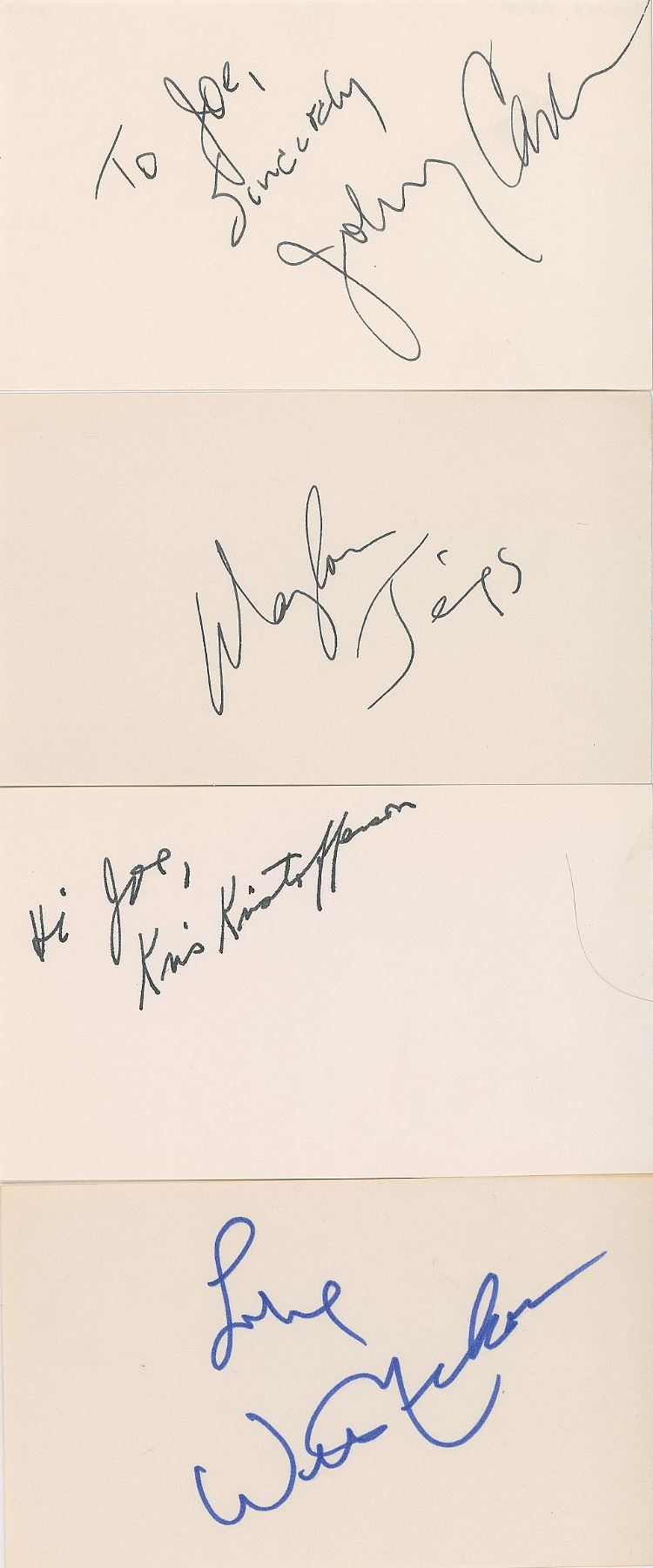 Desirable collection of four ink signatures from the country music supergroup on individual off-white 5 x 3 cards, including: "To Joe, Sincerely, Johnny Cash," "Hi Joe, Kris Kristofferson," "Waylon Jennings," and "Love, Willie Nelson." In overall very fine condition. Originally obtained in person by a New York autograph collector who collected from the 1950s through the 2000s.
