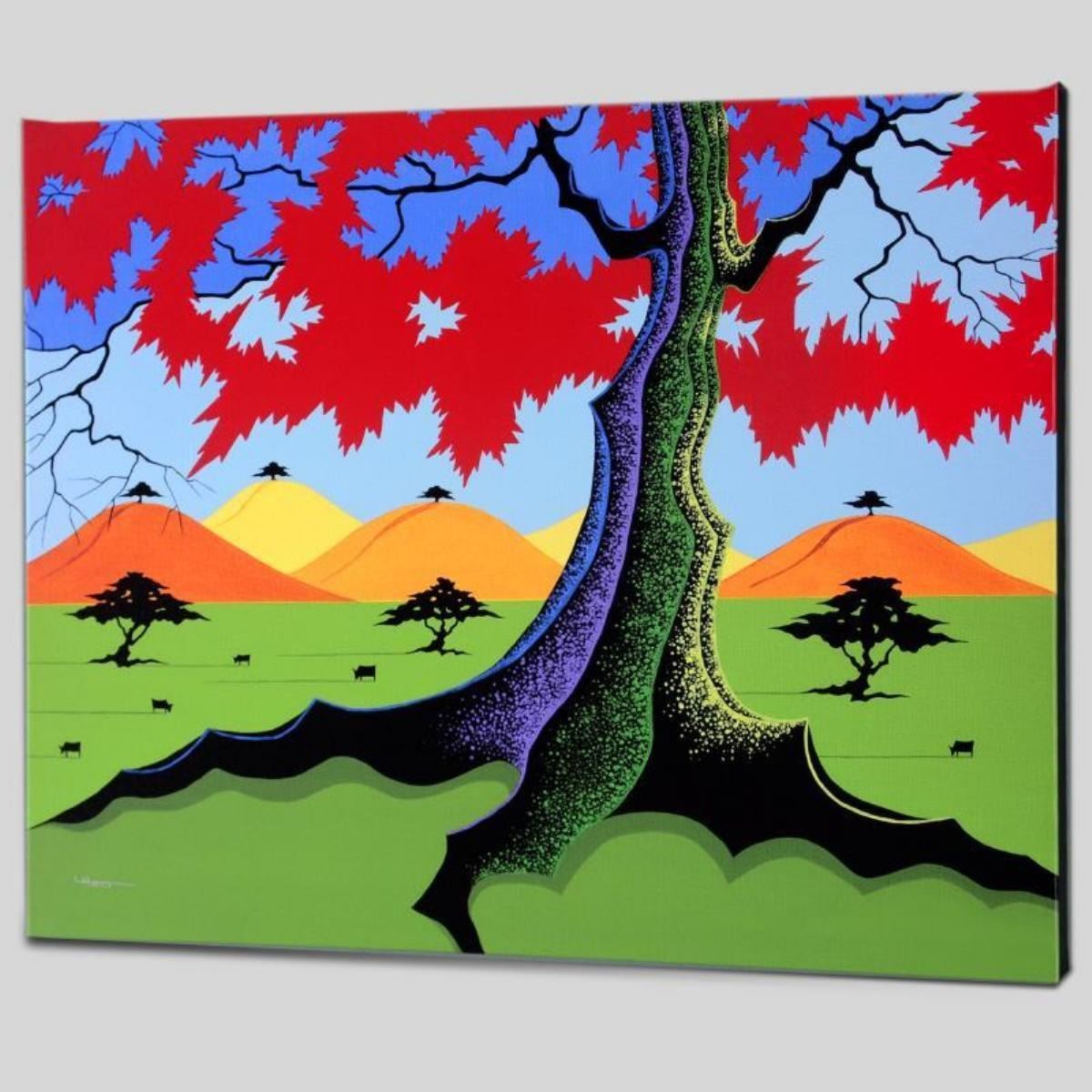 Larissa Holt, a student of distinguished artist Eyvind Earle(1916-2000), uses bold colors and breathtaking scenery to create images of Nature in her own unique style. "The Hills Have Trees" is a limited edition giclee on stretched canvas by Holt, numbered and bearing Holt's authorized signature. This piece comes gallery wrapped. Includes Letter of Authenticity. Measures approx. 27" x 22" x 1.5" (image). This item requires special handling and may have a longer than usual turnaround.
