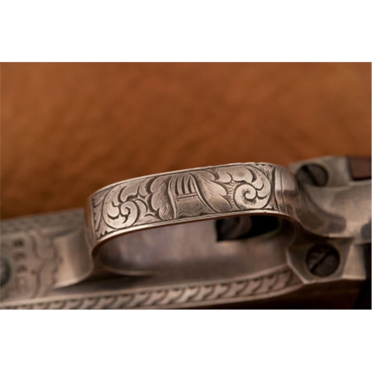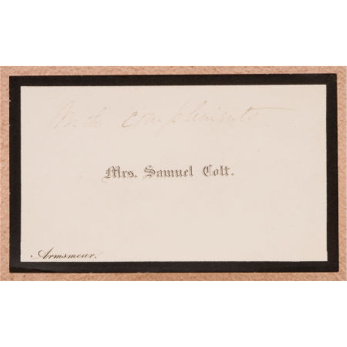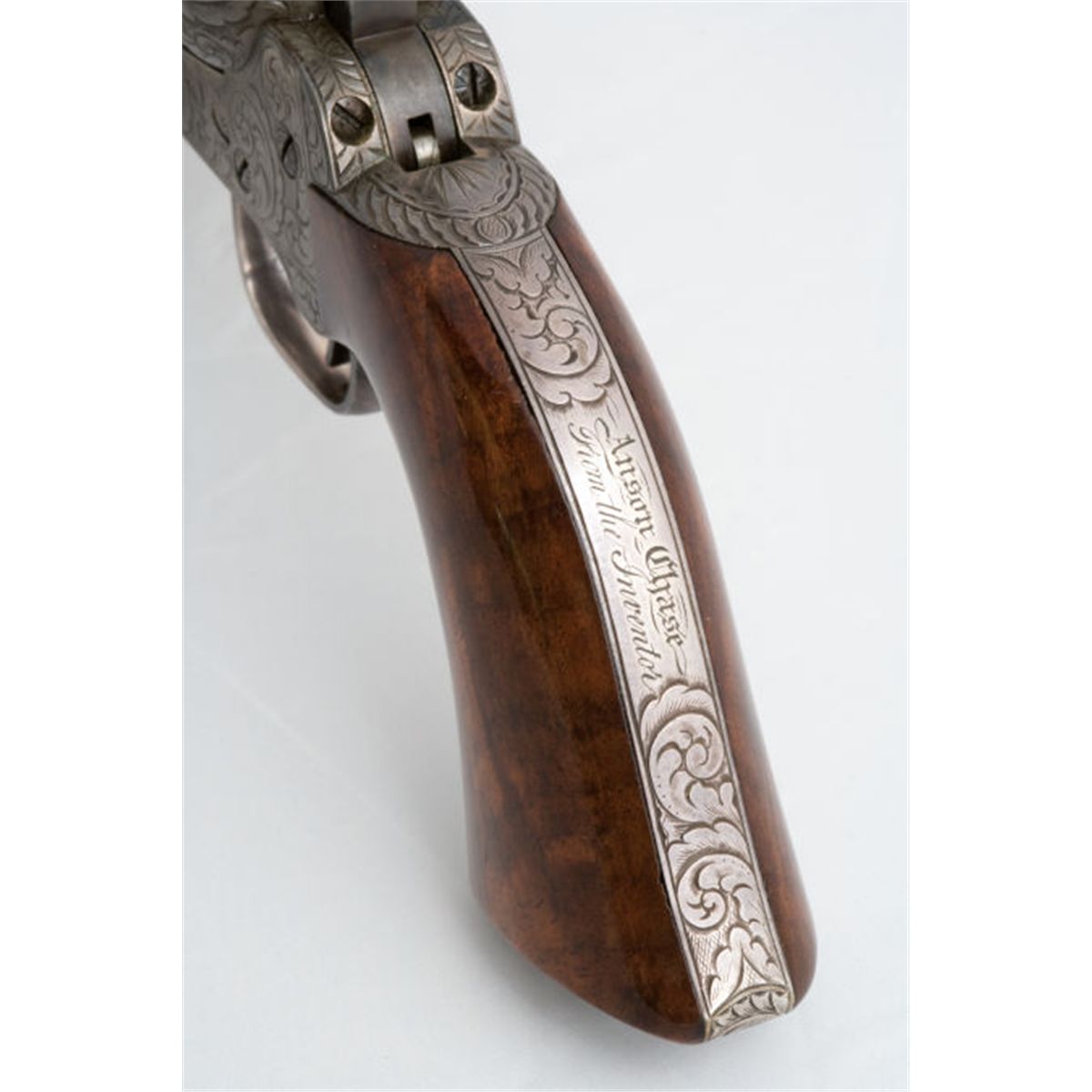 The Historic and Important Deluxe Engraved Colt Model 1849 Pocket Revolver Presented to Gunsmith Anson Chase from the Inventor, Colonel Colt The silver-plated backstrap Inscribed:Anson ChaseFrom the Inventor.Serial number 33598/. .31 caliber, 5-shot cylinder with stagecoach holdup roll scene. 5-inch octagon barrel with brass pin front sight. Top of barrel inscribed Saml. Coltwithin scroll borders. Scroll and border engraved in doughnut or cloud style and relatively profusely, with coverage on the barrel, loading lever, frame, hammer, and gripstraps. Screws also engraved, as is the wedge. Dolphin head motif on each side of the hammer. Richly and finely knurled hammer spur. Blued finish, with color case-hardened frame, hammer, and loading lever, and silver-plated brass gripstraps. The grips of varnished walnut of select grain.Accompanied by gunmaker's pull ink and embossed print from the barrel lug of Colt Navy revolver, serial no. 3769, featuring an engraved portrait of Colonel Samuel Colt. The pull believed to have been done by the engraver himself, attributed to Waterman Lilly Ormsby. Measuring 1 ¼- by 2 5/8-inches, this pull was taken from the presentation Model 1851 Navy given by Colonel Samuel Colt to his chief patent attorney, Edward N. Dickerson.Further, the pull was based on a specific daguerreotype, made of Colonel Samuel Colt in 1851, passed down through generations from the Colt estate to a grand nephew of Colonel and Mrs. Colt, Caldwell Colt Robinson. Also accompanied by a personal card of Mrs. Samuel Colt, from her estate, Armsmear, and bordered in black. An inscription in her handwriting states "with compliments." The card possibly used by Mrs. Colt in presenting a copy of the book Armsmear, which she had published as a memorial to her late husband, in 1866. The card measures 1 15/16-inches by 3 3/16-inches.Varnished rosewood case with escalloped brass plaque inlaid on lid, ivory keyplate inlaid on front of case. The casing lined in burgundy velvet. Embossed American eagle and shield powder flask, brass double cavity bullet mold, tin of Eley Bros. percussion caps with green paper label, blued L-shaped screwdriver/nipple wrench, packet of combustible envelope cartridges by Colt's Cartridge Works, and miscellaneous round and conical lead projectiles. Green paper cover on bottom of case.Quoting from the detailed documenting letter from R.L. Wilson, accompanying the set:The Anson Chase-Samuel Colt presentation Model 1849 Pocket revolver is of museum quality and importance. If it were a part of the Colt Collection of the Wadsworth Atheneum Museum of Art, or of the Connecticut State Library, its display location would be directly next to prototype pieces which Chase made for young Samuel Colt, in the early 1830s. The author regards this cased revolver as one of the most historic and interesting of presentations made by Samuel Colt. It honors the principal gunmaker who built the first of the Colt revolvers, and was a gift from the inventor himself.Considering that Colt had called on Chase to appear as a witness for the plaintiff (Colt) in the Colt vs. Massachusetts Arms Co. patent litigation trial of 1851, it is reasonable to state that this presentation revolver was in appreciation of Chase's testimony.At about the same time that Colt presented this cased revolver to Chase, the Colonel also presented an elaborate cased set of an inscribed Model 1849 Pocket revolver (serial no. 19395) and a matching Model 1851 Navy (no. 3769) to his principal attorney in the Colt vs. Massachusetts Arms Co. trial, E.N. Dickerson. The Navy was engraved with a portrait bust of Colonel Colt, on the right side of the barrel lug. The gunmaker's pull accompanying the Chase revolver is an impression taken directly from the portrait on Dickerson's Navy pistol, at the time of its manufacture.Numerous advertisements have been located by researcher Conor FitzGerald, in regard to the gunsmithing and clock-making career of Anson Chase. Some samples are enclosed.Conclusion:As the gunsmith who made the first prototype of the Colt revolver (a handgun which exploded when fired by Samuel Colt), and other early Colt repeating firearms, Anson Chase played a key role in the early evolution of Colt's invention. During the landmark trial, Colt vs. Massachusetts Arms Co., Anson Chase appeared as a witness for the plaintiff, Samuel Colt. The successful conclusion of the trial, litigated principally by Edward N. Dickerson, was instrumental in protecting Samuel Colt's pistols from being infringed upon by rivals, not the least of which was the defendant, the Massachusetts Arms Co., Chicopee Falls, Massachusetts. Therefore, Colonel Colt's presentation of this cased, engraved and inscribed Pocket Model revolver is of inestimable significance in the history of Colt firearms. The set represents the gratitude of Samuel Colt, to the talented gunsmith who c. 1831-32 assisted the youthful inventor in fulfilling his dream.The fact that the set is accompanied by a personal calling card from Mrs. Samuel Colt, as well as the gunmaker's pull taken at date of manufacture from the Dickerson Navy Colt revolver, adds to the value and rarity of this unique and important ensemble.The daguerreotype of Colonel Samuel Colt, c. 1851 pictured above is the source image for the engraved portrait of Colt on the barrel lug of the E.N. Dickerson Navy. See volume I, Chapter IV of Robert M. Lee and R.L. Wilson, Magnificent Colts, which publishes the E.N. Dickerson cased set of presentation Colt revolvers, the Colonel Colt daguerreotype and the gunmaker's pull. The photo of the daguerreotype courtesy Albert Brichaux Collection.Literature:See American Percussion Revolvers, page 78.R.L. Wilson, The Colt Engraving Book, volume I, page 48. The caption for the three color illustrations includes the following statement:This set as one of the most historic and important of presentations made by Samuel Colt; it honors the man who made the first of the Colt revolver