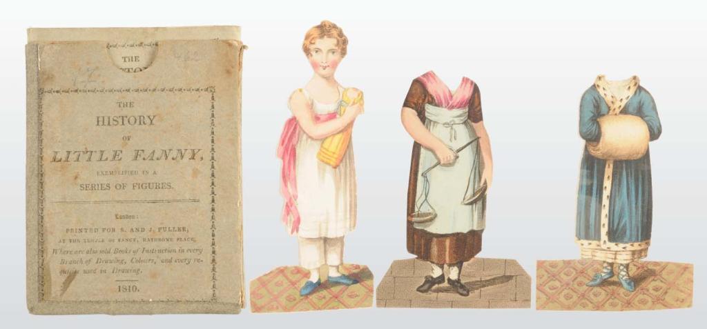 Description Dated 1810. Printed by the Fuller Company, this 4" x 5" book is in a cardboard case, housed in a replica of a child's book. The doll and one costume are from a later set. Three outfits belong to an earlier version of this series where the head slipped into pockets on the reverse of the clothing. Very good condition.