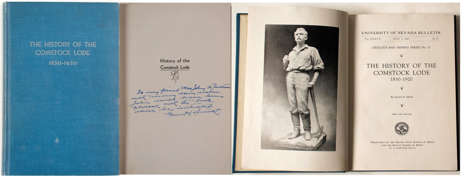 Hardcover 297pp,dedicated by author Grant Smith. From the collection of the former President of the Nevada Historical Society, Robert L. Fulton. City: Virginia City State: Nevada Date: 1943