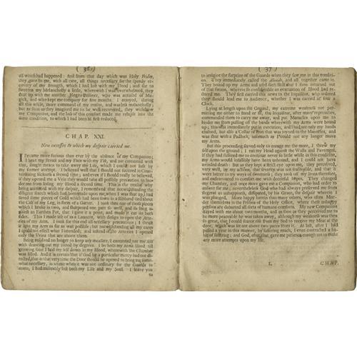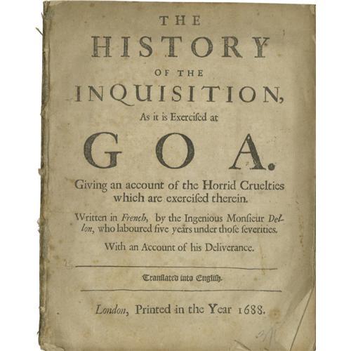 <B><I>The History of the Inquisition</B></I></B></I> <I>As it is Exercised at Goa.</B></I> By Monsieur Charles Dellon (London: 1688), 70 pages, no wraps, 12mo (6.25" x 7.75"). The translation information is found in the first few introduction pages. This booklet was written in direct defiance of the oath of secrecy required by the Tribunal. Dellon was a French doctor who was arrested and imprisoned for three years. During his three year term in the cells and dungeons of the inquisition, he gathered material which would later inspire this booklet, and fuel the struggle against intolerance during the Enlightenment period. The Goa province was one of the three Portuguese provinces in India, and had the reputation of being the most cruel and fervent during the Inquisition. A wonderful booklet which provides eyewitness insight into one of the darker times in world history. It was so controversial and factual that it was placed on the Church's banned books list in 1690. <BR><BR>The booklet is in fair condition; disbound; no wraps; edges show minor wear; slight soiling of the pages.