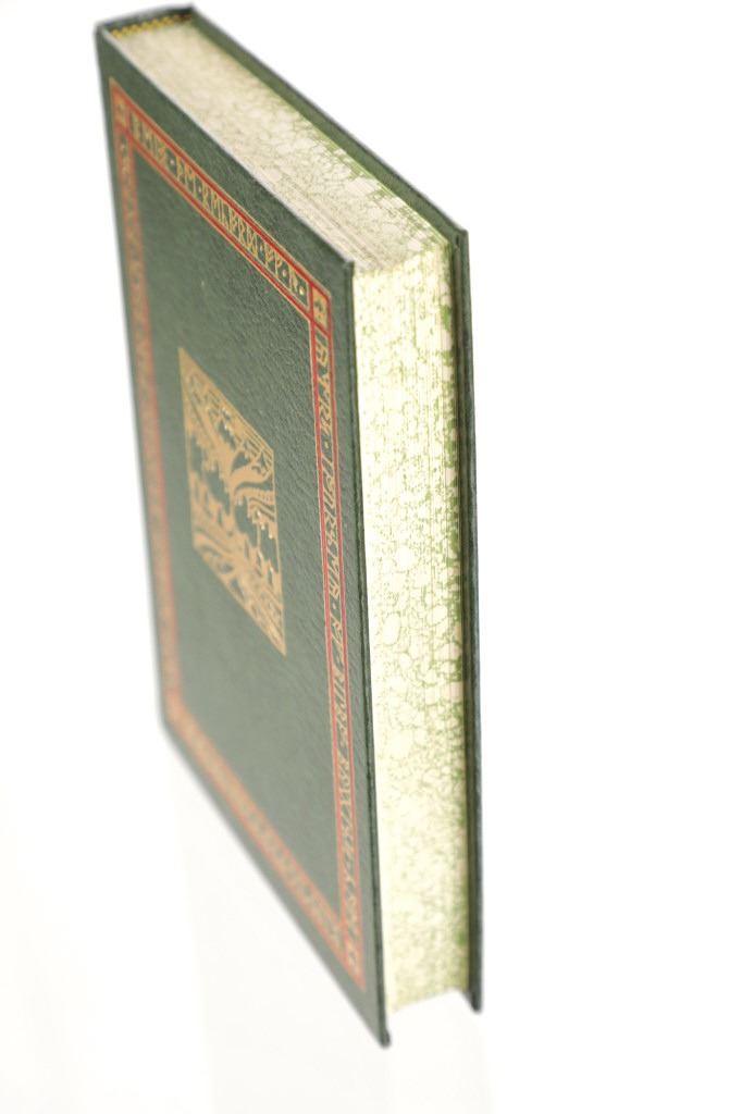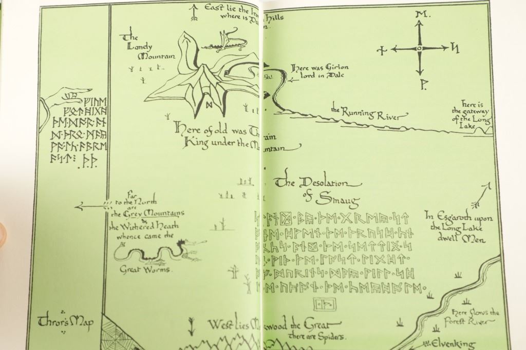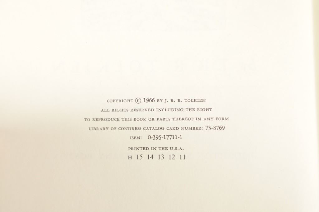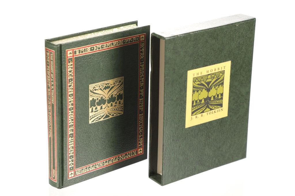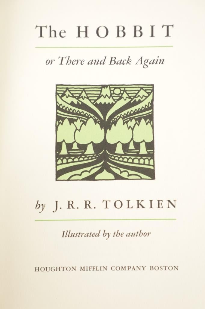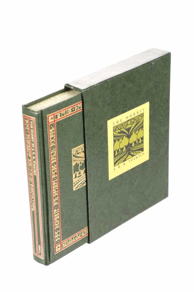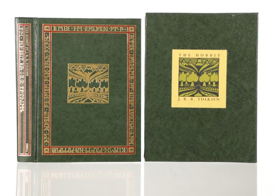 Featured in this lot is this "Hobbit Anniversary Edition in Slipcase", 1966, J. R. R. Tolkien, publisher Houghton Mifflin Company. John Ronald Reuel Tolkien CBE FRSL was an English writer and philologist. He was the author of the high fantasy works The Hobbit and The Lord of the Rings. From 1925 to 1945, Tolkien was the Rawlinson and Bosworth Professor of Anglo-Saxon and a Fellow of Pembroke College, both at the University of Oxford. This "The Hobbit, or There And Back Again" anniversary edition features the original illustrations and design. This large work has the iconic original dustjacket design, as well as numerous colour illustrations. A rare and highly sought-after edition. This green textured leatherette bound illustrated gold and red gilt hardcover is in very fine condition, near new condition with runes and red highlights on front cover. Intact pages have marbled top, bottom and fore edges. Green slip case is in very nice condition, illustrated title label on cover. Measures in slip case 7"W x 9.5"L x 1.5"D approximately. Weight approximate 2lb