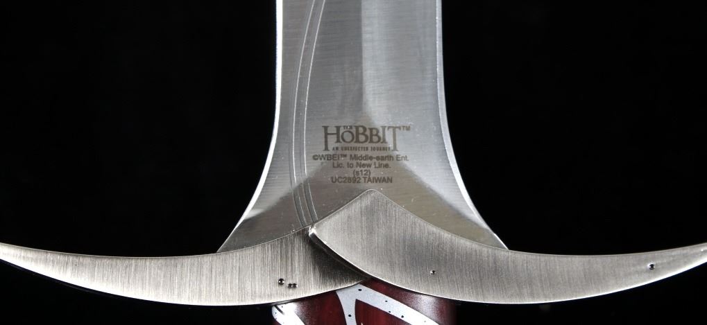Featured in this lot we have a Sting sword and sheath replica after The Hobbit An Unexpected Journey. This sword shows a steel blade with metal guard and pommel with a wood grip. The blade of Sting is marked "The Hobbit An Unexspected Journey WBEI Middle-Earth Ent. Lic. to New Line.(s12) UC2892 Taiwan". The piece matches the prop used in the movie with the designs of the original sword such as the swirling vine etched into the blade. The sheath features leather wrapped construction with metal fittings on each end with a leather carrier strap. The sword and sheath show very good condition with a few minor scuffs. The sword measures 22" long with a 15 1/2" blade.