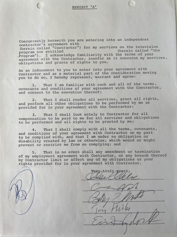 The Hollies signed contract autographed by Bobby Elliott, Tony Hicks, Allan Clarke, Eric Haydock, and Graham Nash. 9x12 inches. DB690